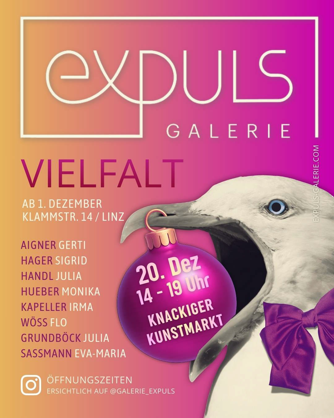 Am Samstag, 20. Dezember freuen wir uns auf einen kleinen Kunstmarkt in unserer Galerie! Es wird, neben vielen Kleinigkeiten und Geschenkideen, auch eine kleine Verköstigung und Eingelegtes geben von Café Mulatschag "Feines aus Küche und Garten".