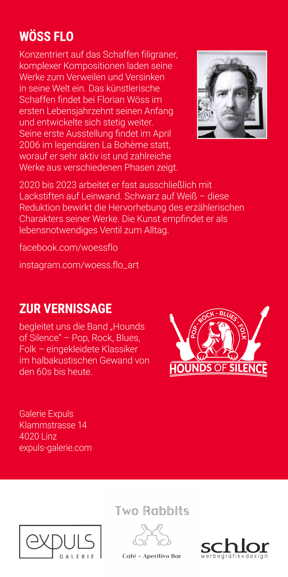 Konzentriert auf das Schaffen filigraner, komplexer Kompositionen laden Wöss Flos Werke zum Verweilen und Versinken in seine Welt ein. Er arbeitet fast ausschließlich mit Lackstiften auf Leinwand. Schwarz und Weiß - diese Reduktion bewirkt die Hervorhebung des erzählerischen Charakters seiner Werke.